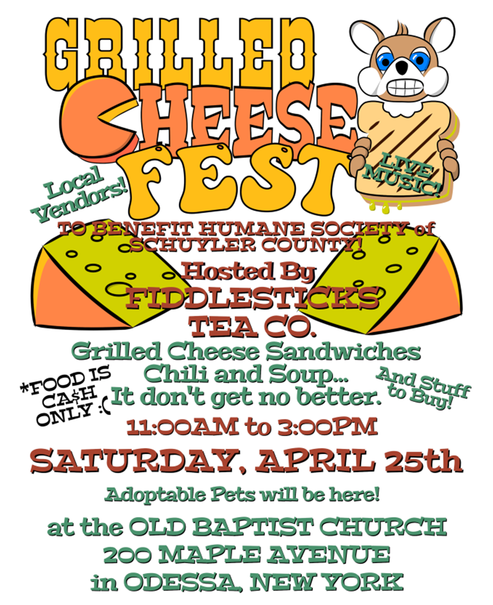 « All Events Grilled Cheese Fest! April 25 @ 11:00 am - 3:00 pm « Tea for Tails and Wine for Whiskers Free Rabies Clinic – Valois Logan Hector Fire Department » Add to calendar Google Calendar iCalendar Outlook 365 Outlook Live Details Date: April 25 Time: 11:00 am - 3:00 pm Event Category: Fundraiser Organizer Fiddlesticks Tea Company Venue Old Baptist Church – Odessa 200 Maple Avenue Odessa, NY United States + Google Map