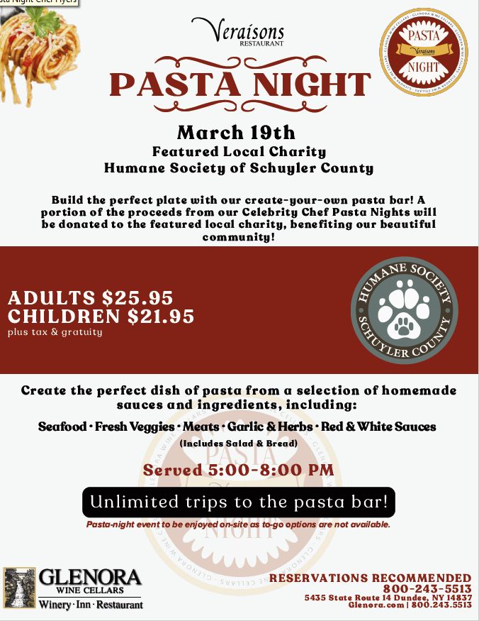 « All Events Veraisons Pasta Night March 19 @ 5:00 pm - 8:00 pm « Bissell Pet Foundation’s Empty the Shelters Event Free Rabies Clinic – Humane Society of Schuyler County » Add to calendar Google Calendar iCalendar Outlook 365 Outlook Live Details Date: March 19 Time: 5:00 pm - 8:00 pm Event Category: Fundraiser Event Tags:Fundraiser Organizer Veraisons Restaurant Phone 800-243-5513 View Organizer Website Venue Veraisons Restaurant 5435 State Route 14 Dundee, NY 14837 United States + Google Map Phone 800-243-5513 View Venue Website